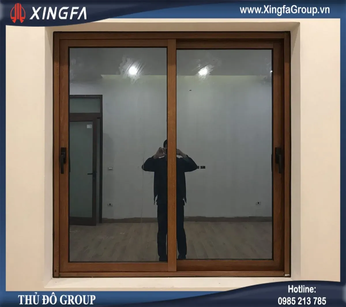 Mẫu cửa sổ mở trượt 2 cánh nhôm Xingfa mầu vân gỗ (mầu giả gỗ tự nhiên)