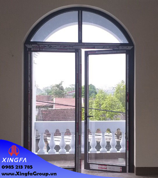 Phần ban công ở mặt tiền của công trình có kết cấu mái vòm nên khi lắp đặt cửa đi có thêm phần vách kính cố định hình mái vòm để trang trí. Cửa đi mở quay 2 cánh nhôm Xingfa có các ưu điểm cách âm cách nhiệt, chịu nước tuyệt đối 100% và chất liệu nhôm siêu bền theo thời gian.