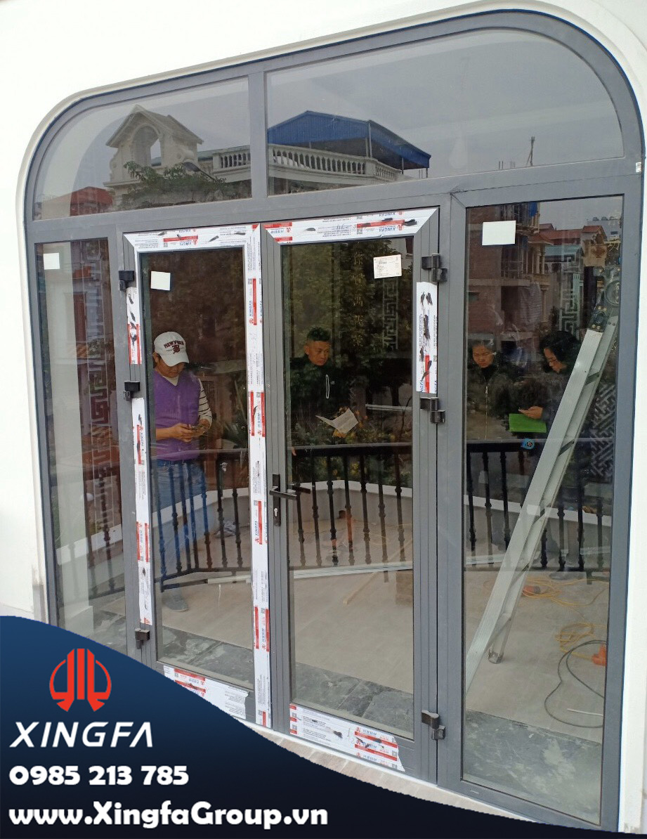 Hình ảnh cửa đi mở quay 2 cánh nhôm Xingfa + vách kính uốn mái vòm