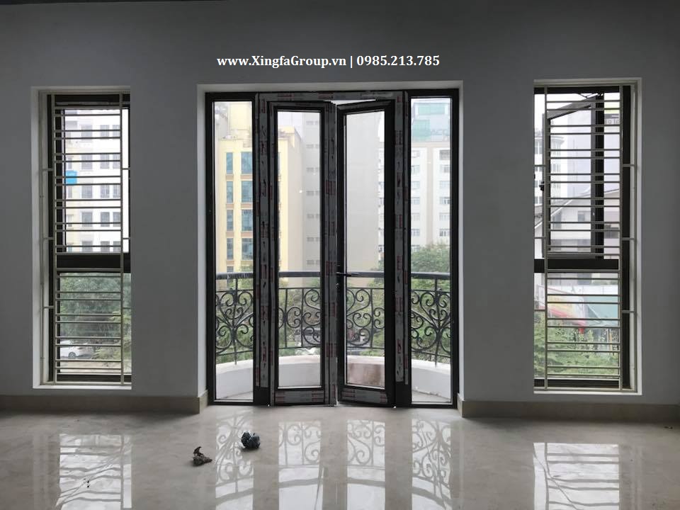 Mẫu cửa đi mở quay 2 cánh nhôm Xingfa kết hợp Fix cố định 2 bên đi ra ban công mặt tiền