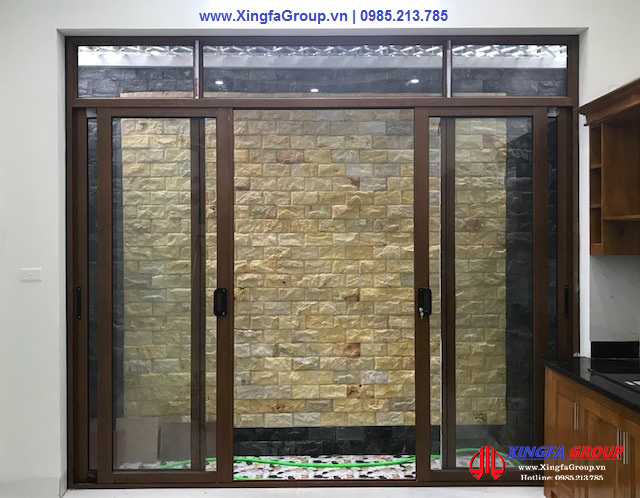 Mẫu cửa đi mở trượt 4 cánh nhôm Xingfa mầu vân gỗ hệ 93 BẢN TO dày 2.0mm