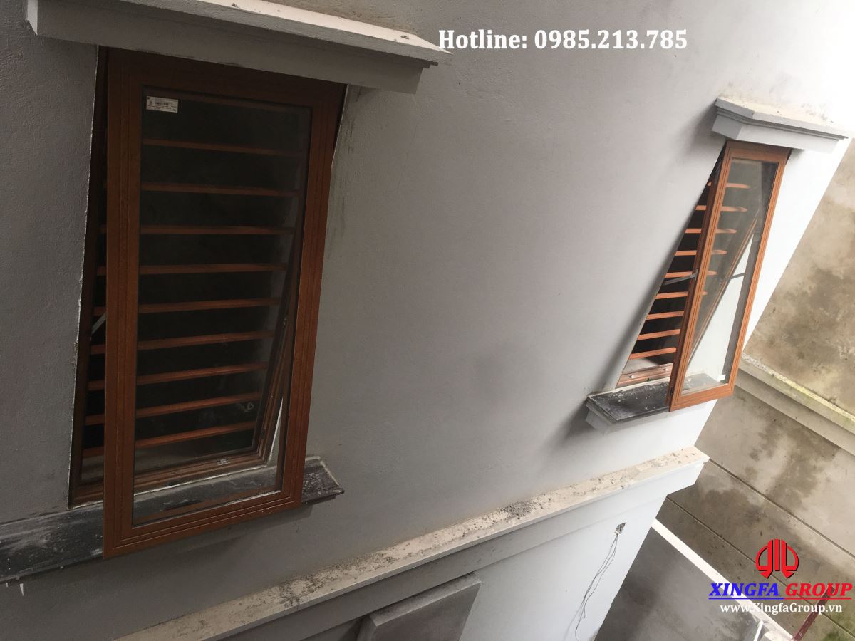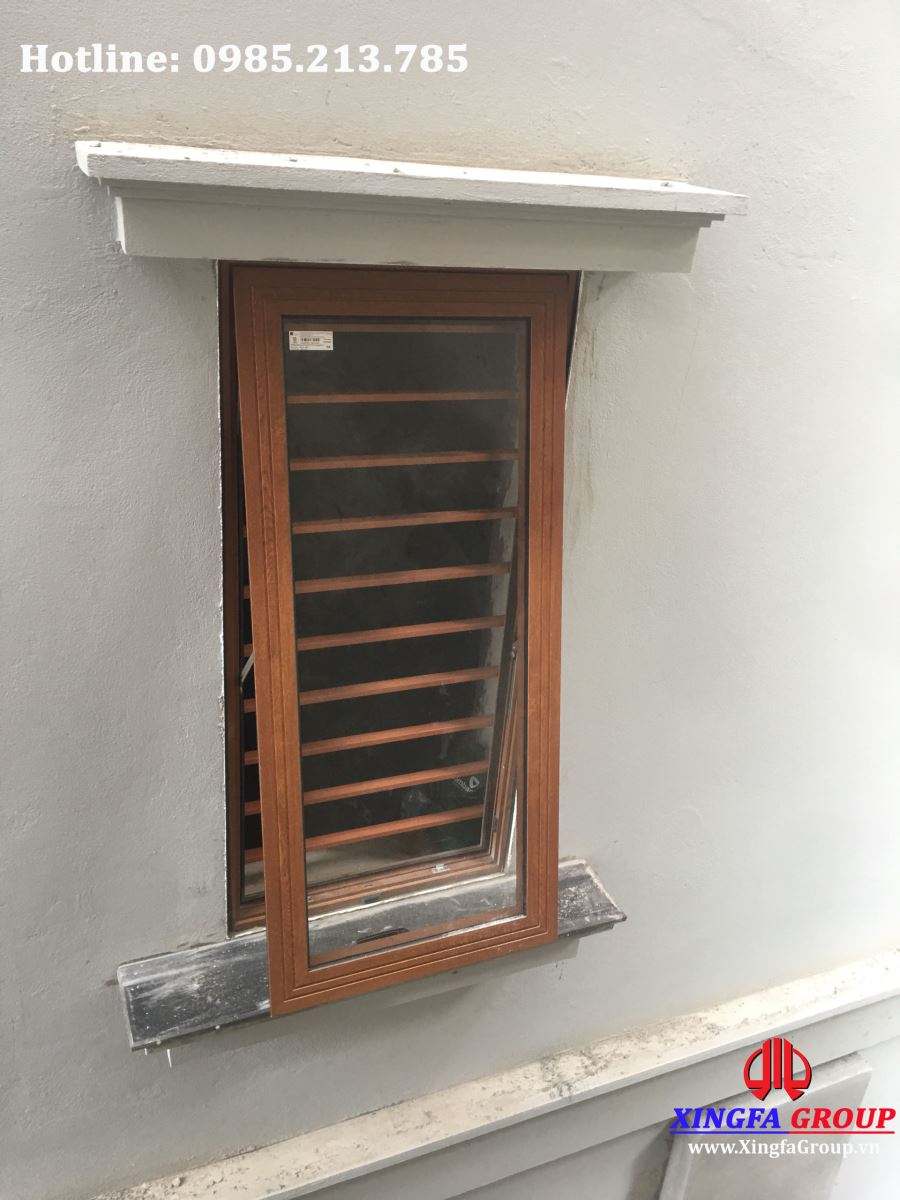 Mẫu cửa sổ mở hất 1 cánh được lắp ghép từ thanh profile nhôm Xingfa mầu vân gỗ.