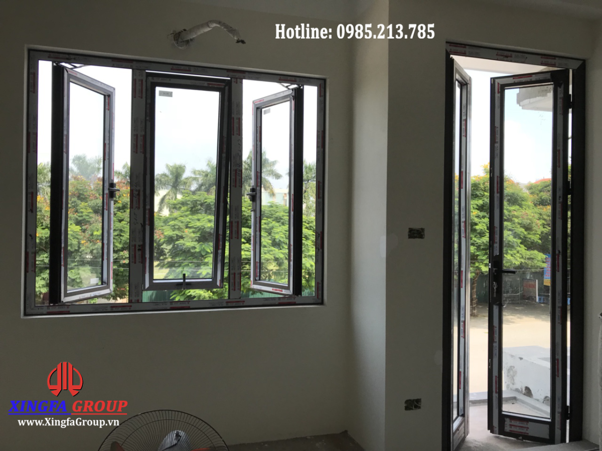 Hình ảnh mẫu cửa sổ mở quay 2 cánh ở giữa là cửa sổ mở hất 1 cánh và cửa đi mở quay 2 cánh được lắp ghép bằng thanh profile nhôm Xingfa hệ 55 có độ dầy 1.4mm cho hệ cửa sổ và dầy 2.0mm cho hệ cửa đi.