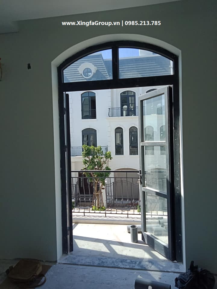 Hình ảnh mẫu cửa đi mở quay 2 cánh nhôm Xingfa kết hợp vòm cong cố định