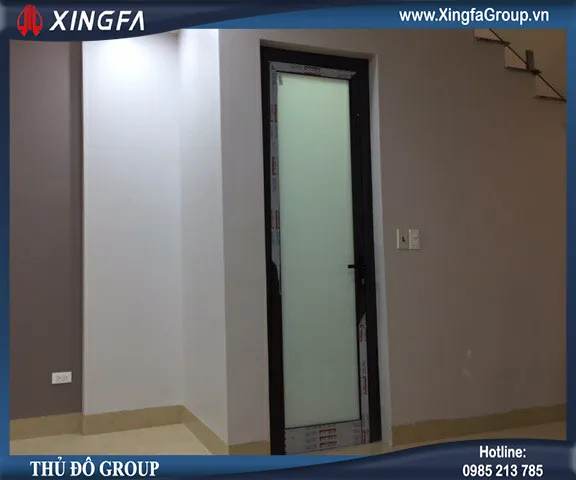 Mẫu cửa đi mở quay 1 cánh nhôm Xingfa dùng kính mờ phun sữa nhà tắm wc