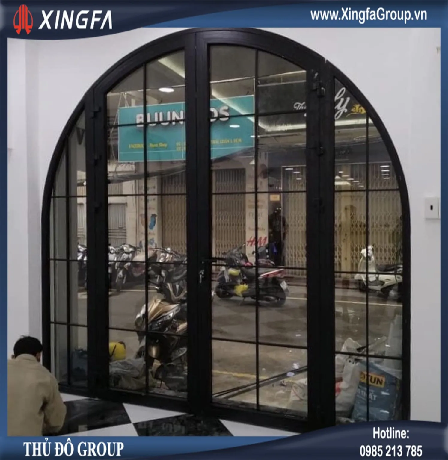 VIDEO cửa nhôm Xingfa uốn mái vòm dùng kính hộp có nan trang trí