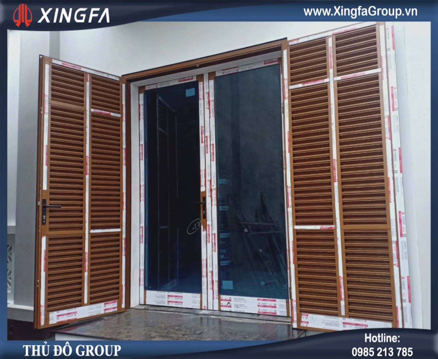 Thủ Đô Group thi công lắp đặt công trình biệt thự sử dụng mẫu cửa đi mở quay 2 cánh đi ra ban công nhôm Xingfa nhập khẩu chính hãng 100% + kính hộp 2 lớp cách âm cách nhiệt và có nan trang trí bên trong tại nhà anh Thanh ở Sóc Sơn, Hà Nội