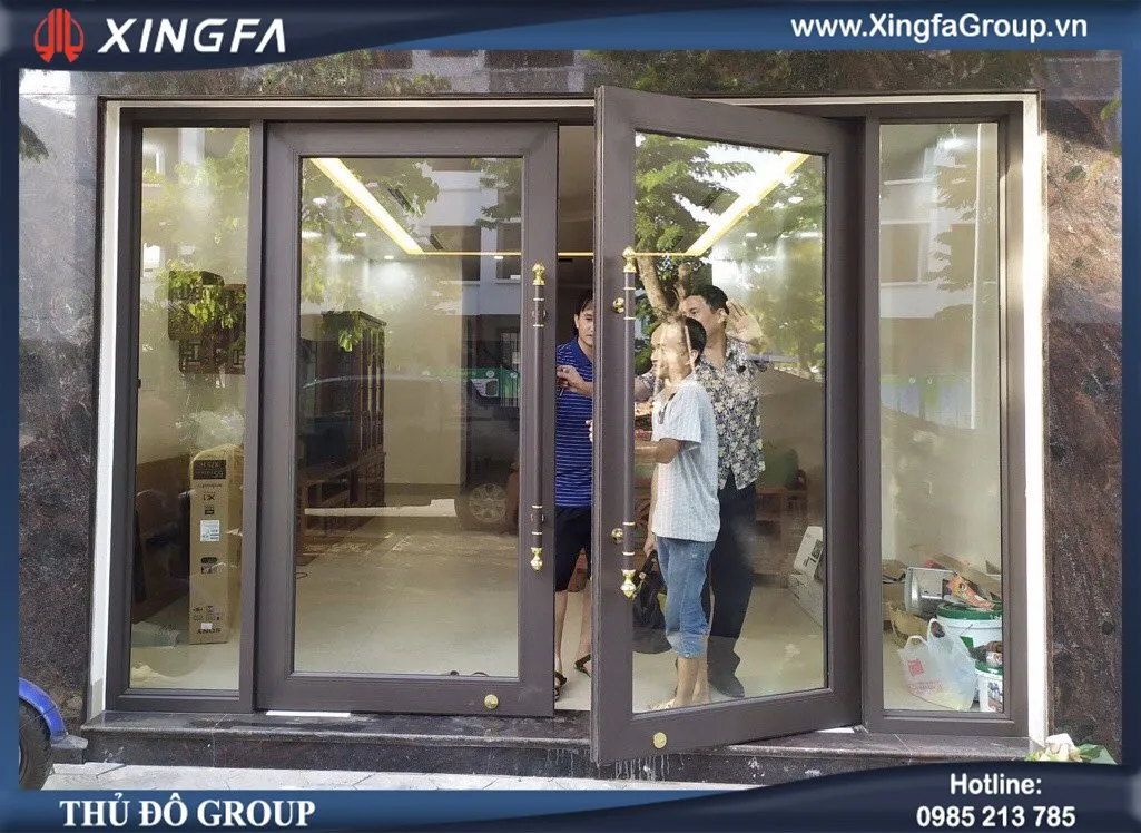 Mẫu cửa đi mở quay 2 cánh nhôm Xingfa mầu nâu cafe + Fix cố định 2 bên +Fix cố định bên trên