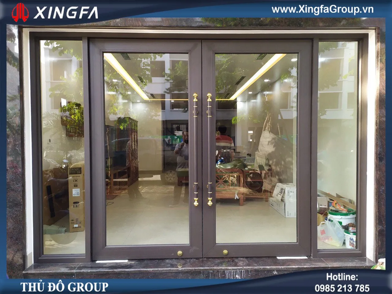 Thủ Đô Group thi công lắp đặt công trình sử dụng mẫu cửa đi mở quay 2 cánh nhôm Xingfa nhập khẩu tại nhà anh Hưng ở căn Nguyệt Quế xx, KĐT Vinhomes Reverside Sài Đồng, Long Biên, Hà Nội
