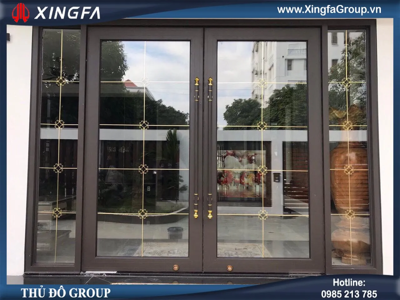 Mẫu cửa đi nhôm Xingfa mở quay 2 cánh + 2 vách cố định fix 2 bên (sử dụng kính hộp 2 lớp cách âm cách nhiệt + có nan trang trí bên trong dày 5-9-6,38mm)