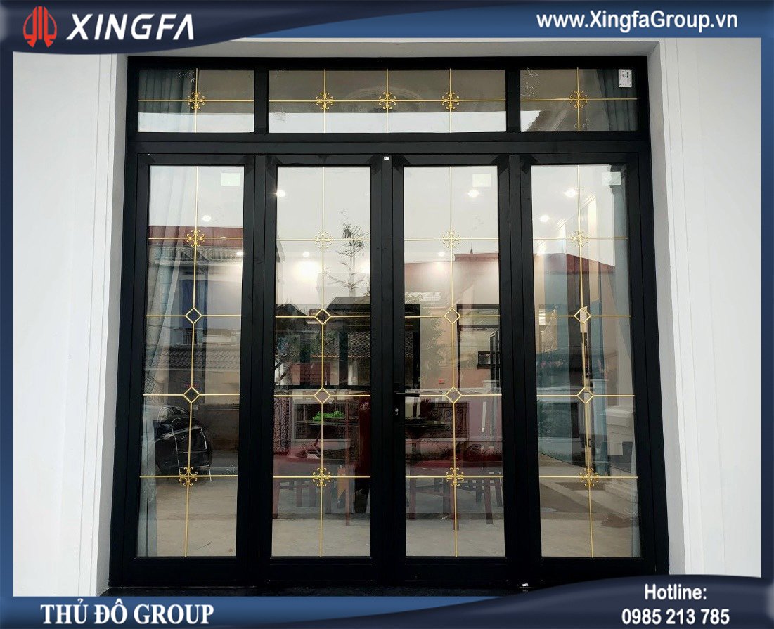 Mẫu cửa đi mở quay 4 cánh nhôm Xingfa sử dụng kính hộp 2 lớp cách âm cách nhiệt, chống nóng chống ồn, an toàn 6,38-9-6,38mm có nan trang trí mạ đồng bên trong