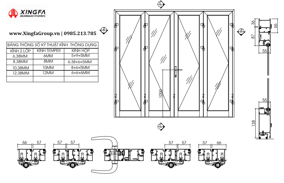 Bản vẽ kỹ thuật cửa đi mở quay 4 cánh nhôm Xingfa nhập khẩu