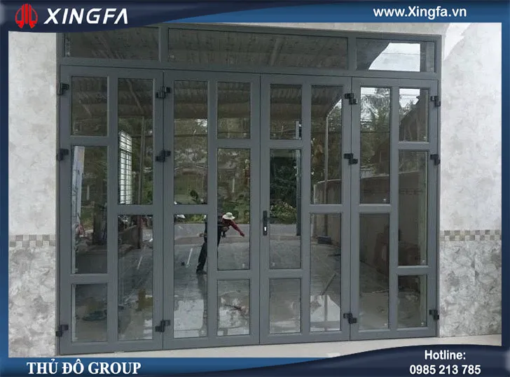 Mẫu cửa đi mở quay 4 cánh nhôm Xingfa mầu ghi