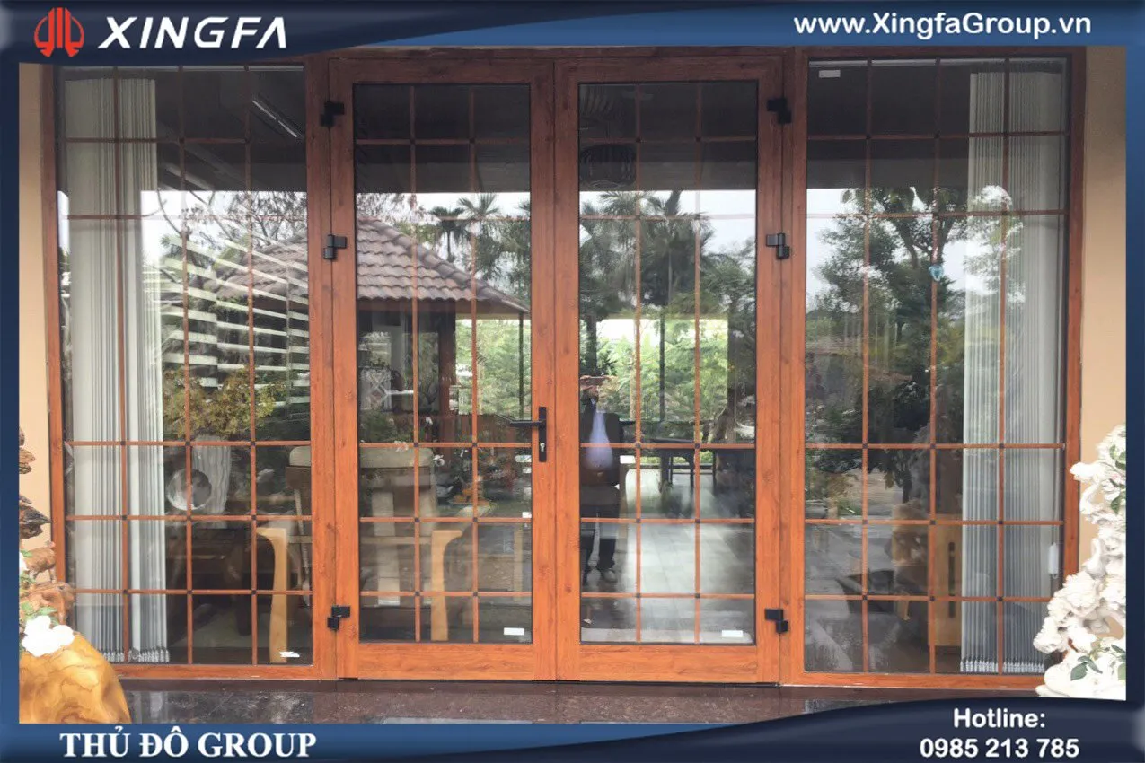 Mẫu cửa nhôm Xingfa 4 cánh mầu vân gỗ dùng kính hộp 2 lớp cách âm cách nhiệt, chống nóng chống ồn