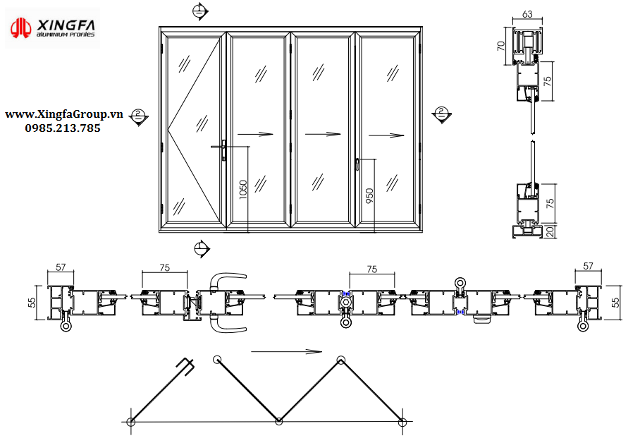 Bản vẽ kỹ thuật cấu tạo cửa đi mở xếp trượt gấp nhôm Xingfa nhập khẩu