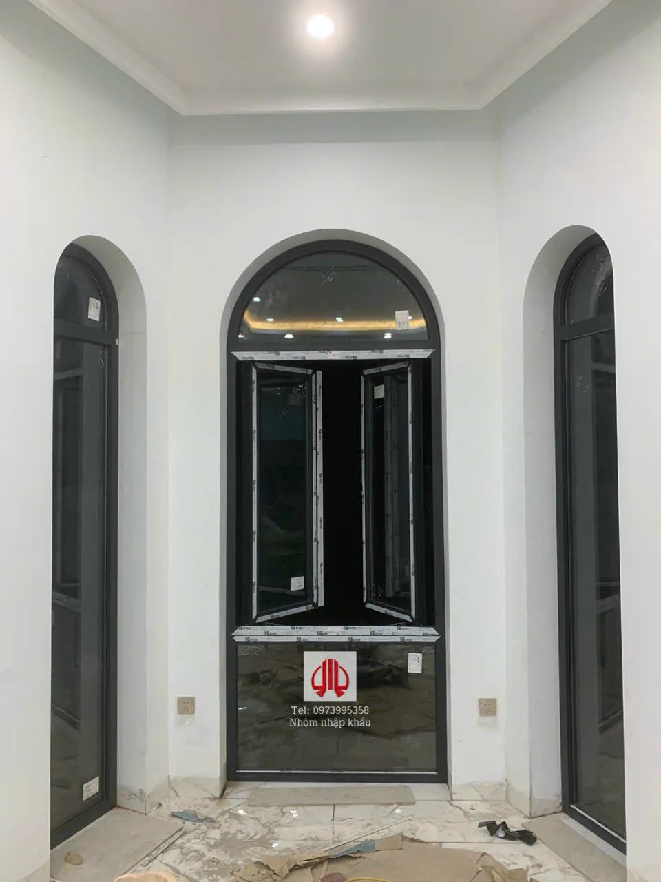 Hình ảnh mẫu cửa sổ mở quay 2 cánh kết hợp vách kính cố định uốn vòm nhôm Xingfa nhập khẩu chính hãng