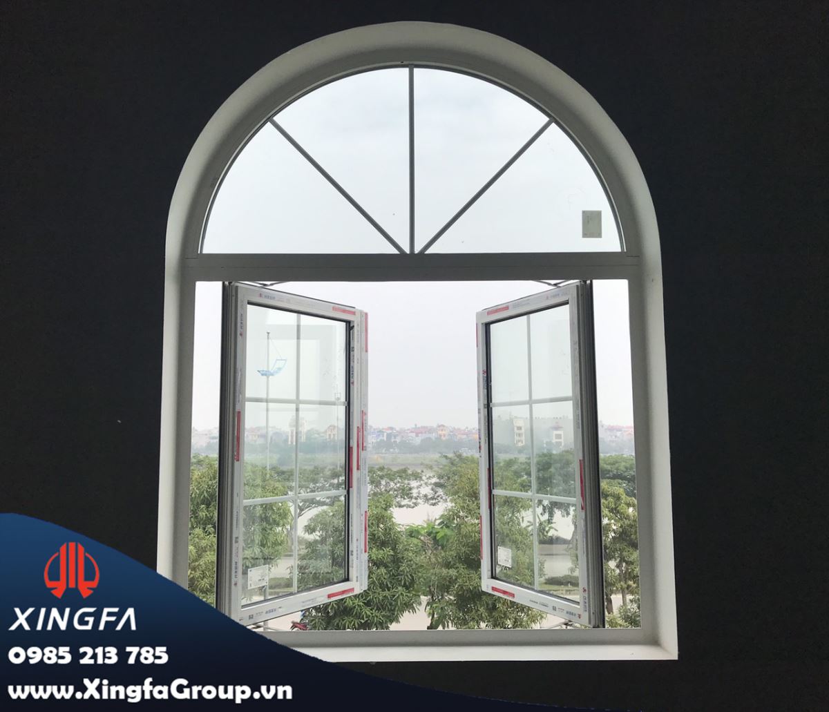Mẫu cửa nhôm Xingfa uốn mái vòm cong với thiết kế hệ cửa sổ mở quay 2 cánh, sử dụng kính hộp 2 lớp cách âm cách nhiệt có nan trang trí bên trong mầu trắng..