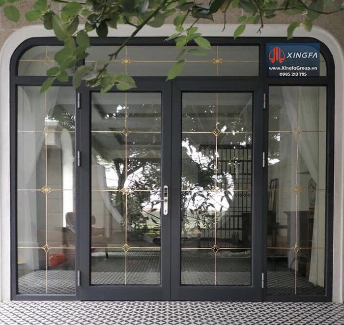 Mẫu cửa đi nhôm Xingfa (mở quay 2 cánh + 2 fix cố định) sử dụng kính hộp 2 lớp cách âm cách nhiệt có nan trang trí bên trong mầu đồng (sử dụng kính có nan hoa đồng)