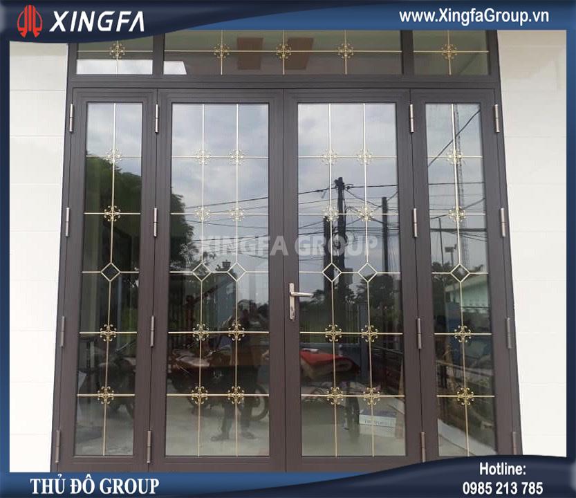Mẫu cửa đi mở quay 4 cánh nhôm Xingfa sử dụng kính hộp 2 lớp cách âm cách nhiệt có nan trang trí bên trong mầu đồng (sử dụng kính có nan hoa đồng)