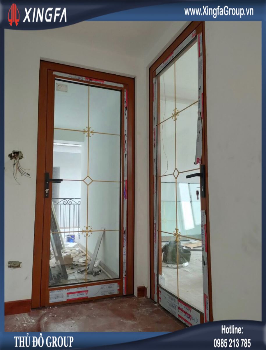 Mẫu cửa nhôm Xingfa dùng kính hộp 2 lớp cách âm cách nhiệt, có nan trang trí bên trong mạ đồng