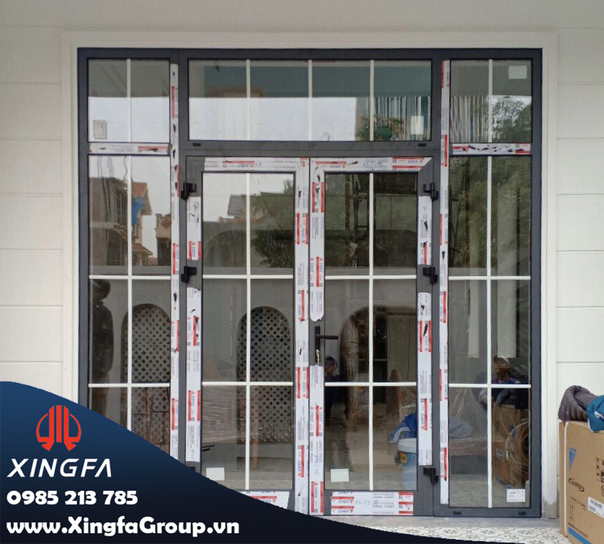 Hình ảnh cửa đi mở quay 2 cánh nhôm Xingfa và vách kính cố định