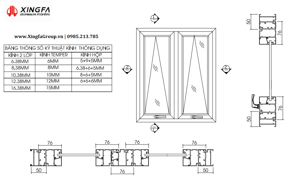 Bản vẽ thông số kỹ thuật cửa sổ mở hất nhôm Xingfa nhập khẩu