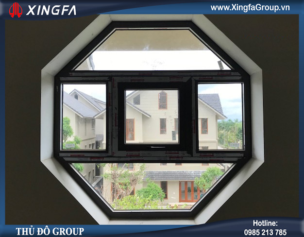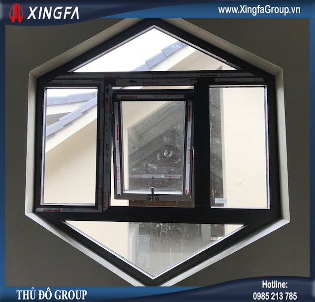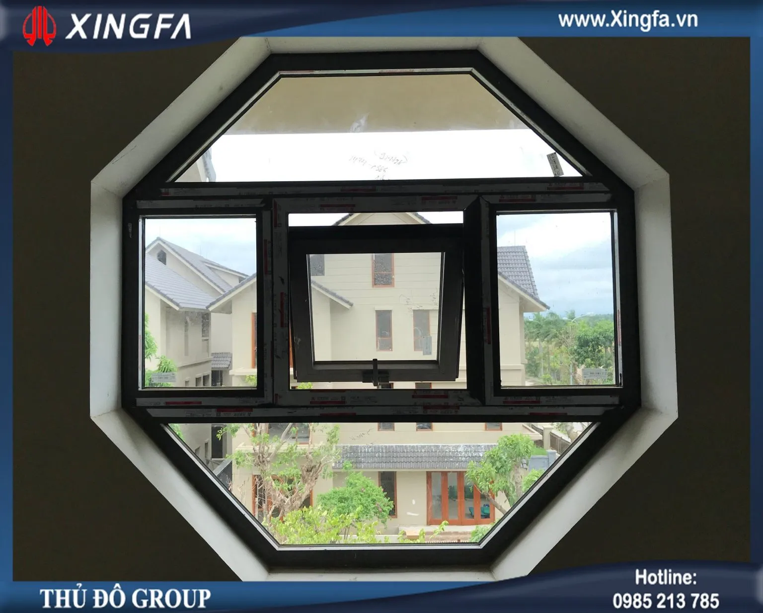 Mẫu cửa sổ mở hất 1 cánh hình bát giác nhôm Xingfa (ép góc 8 cạnh) trên cùng 1 hệ khuôn cửa