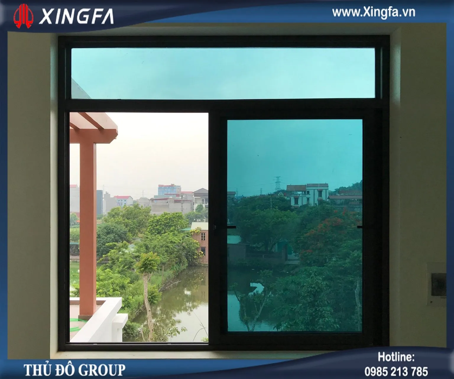 Mẫu cửa sổ nhôm Xingfa mở trượt 2 cánh (dùng kính dán an toàn mầu xanh)