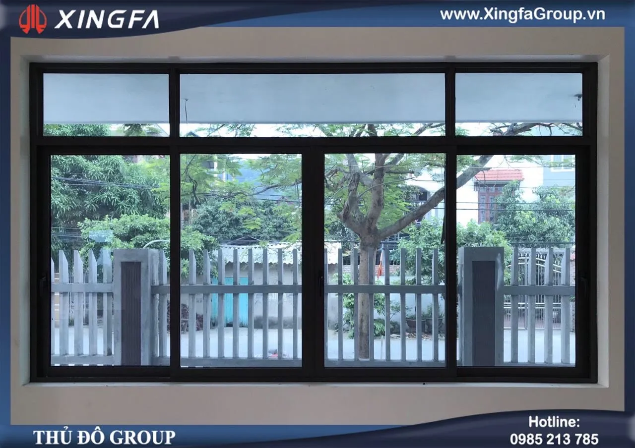 Mẫu cửa sổ mở trượt 4 cánh nhôm Xingfa chia thêm ô fix cố định bên trên mầu Ghi sẫm