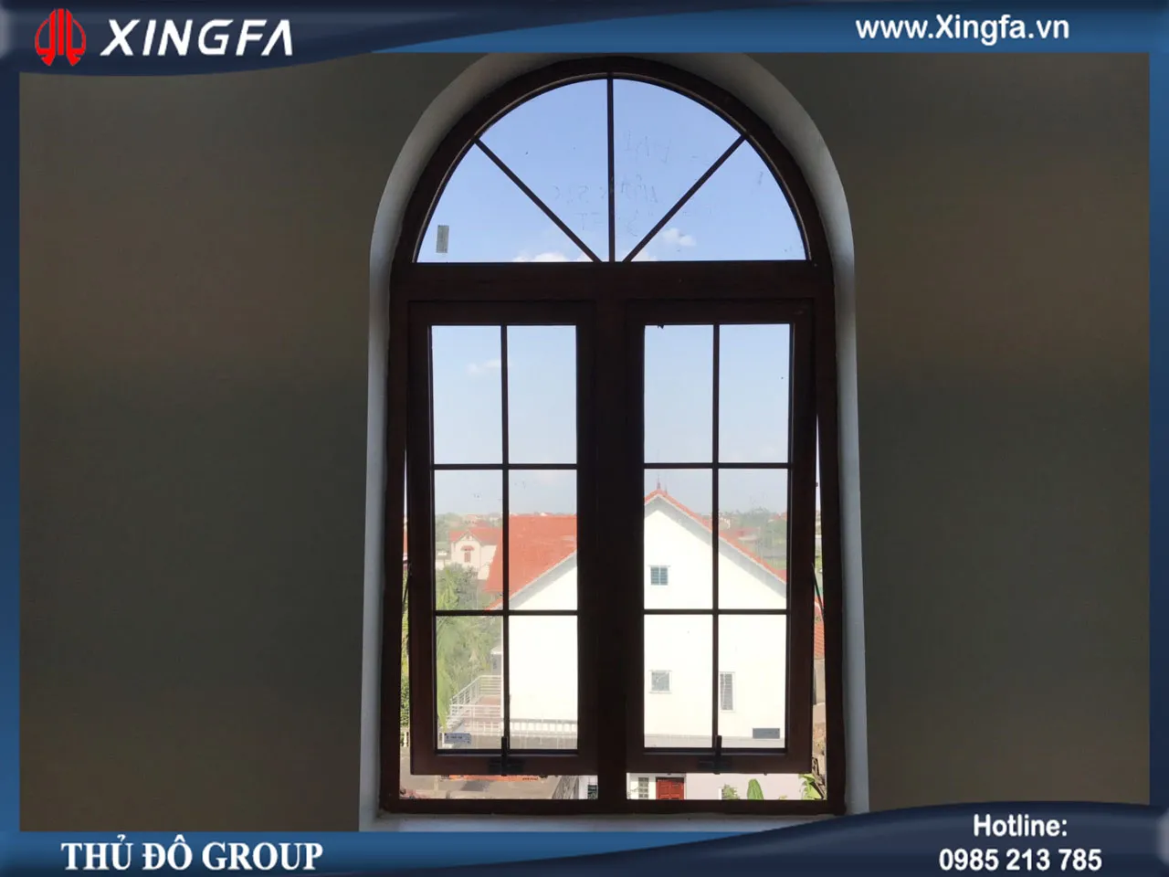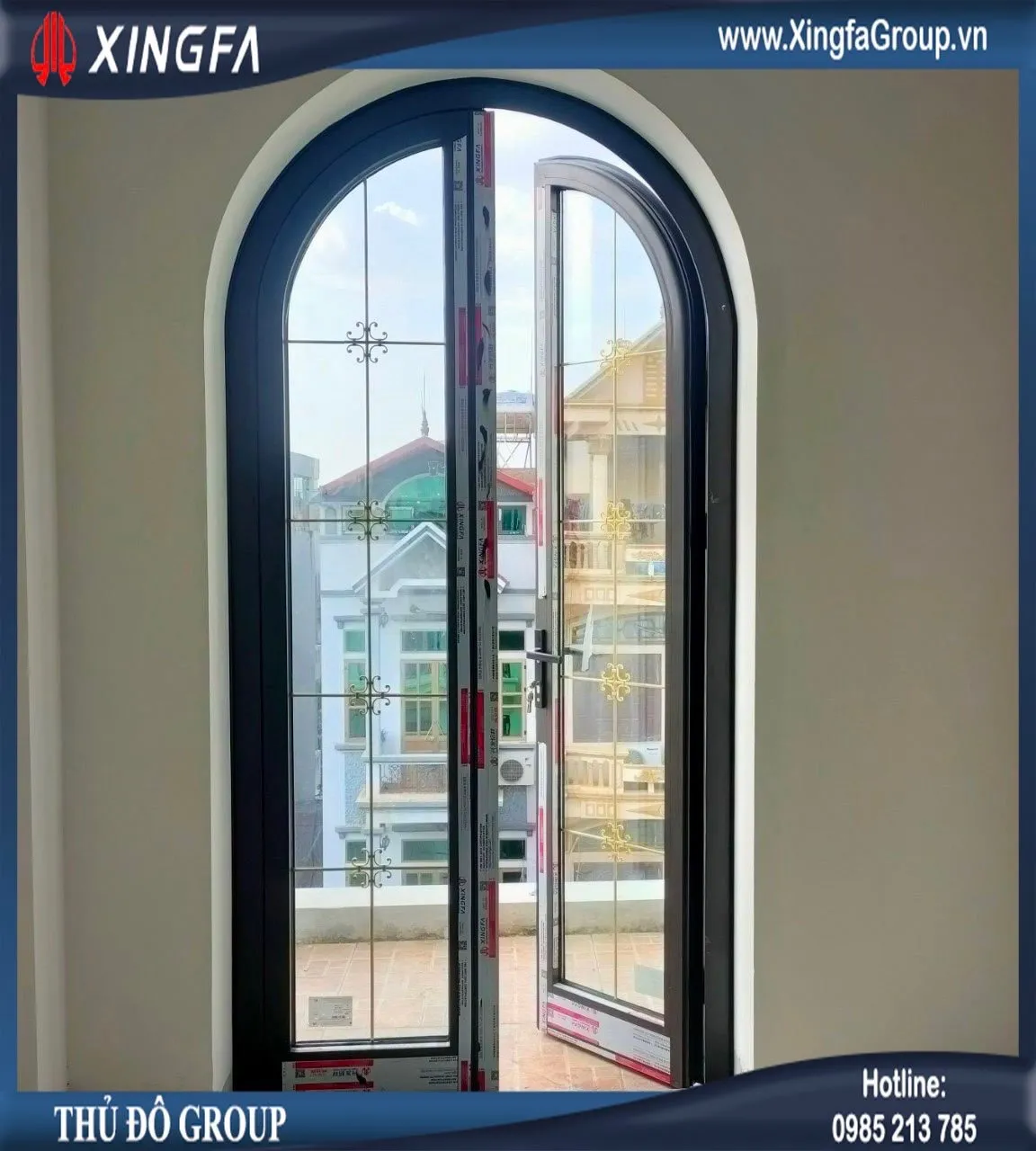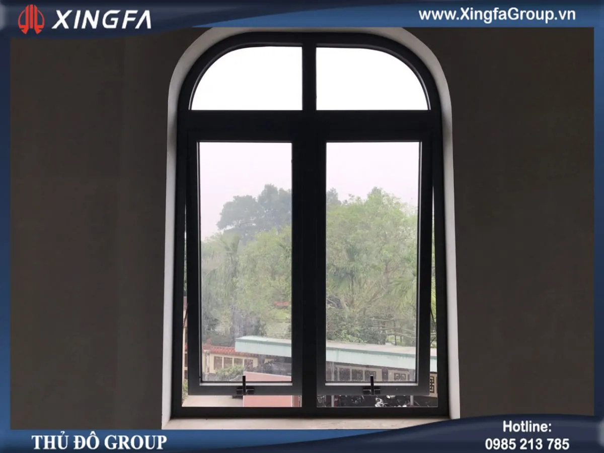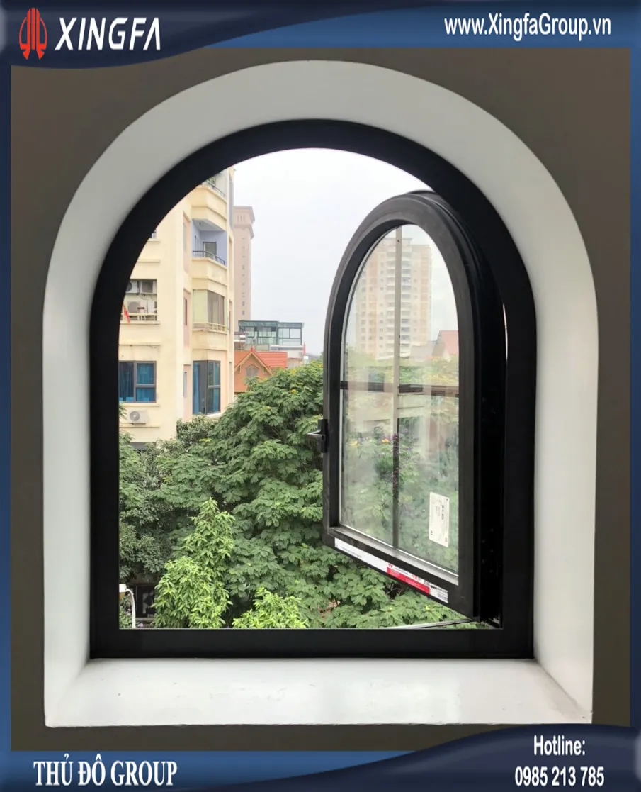 Mẫu cửa sổ mở quay 2 cánh nhôm Xingfa uốn mái vòm cong cả khung khuôn cửa & cánh cửa