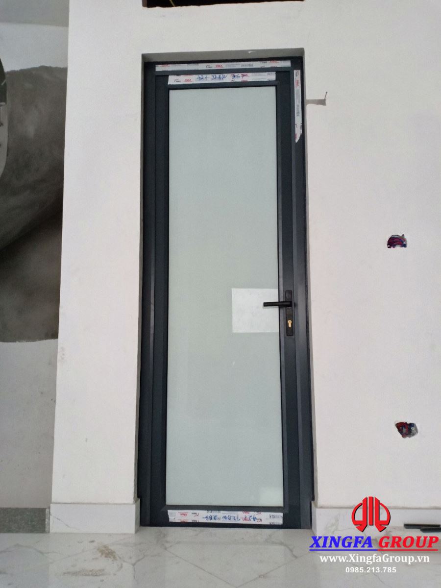 Cửa đi mở quay 1 cánh nhôm Xingfa sử dụng kính dán an toàn màu trắng sữa