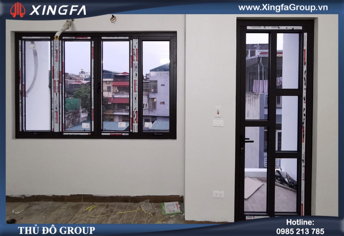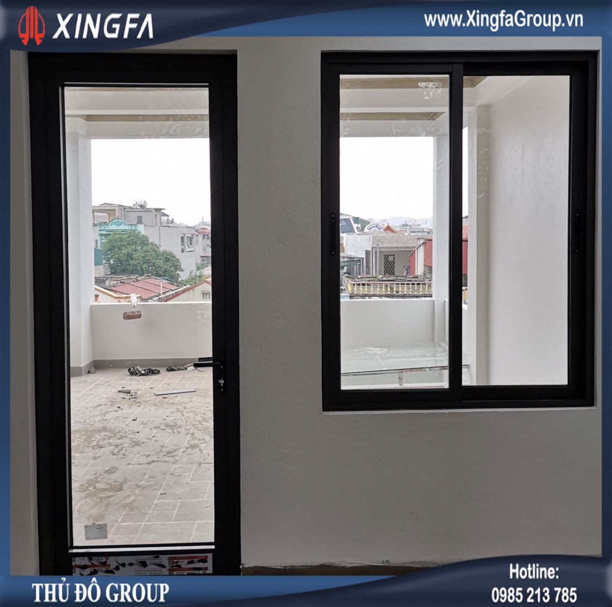 Hình ảnh một bộ cửa sổ mở trượt nhôm Xingfa bên cạnh cửa đi mở quay