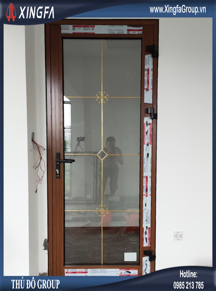 Hình ảnh bộ cửa đi mở quay 1 cánh nhôm Xingfa màu vân gỗ tự nhiên