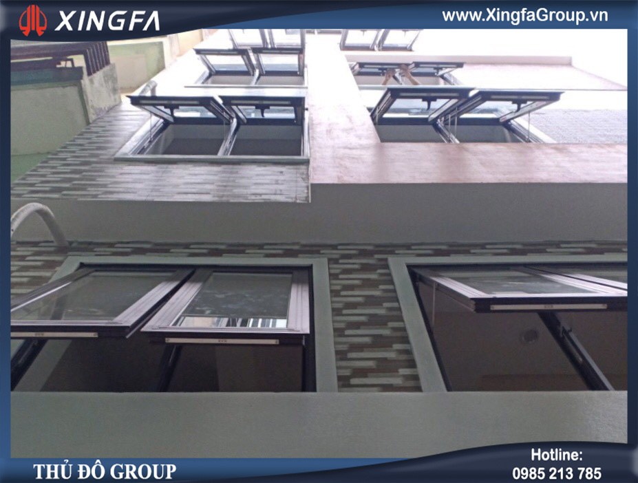 Bên cạnh đó, cũng được lắp đặt tại công trình này là sản phẩm cửa sổ nhôm Xingfa mở hất 1 cánh và 2 cánh. Cửa sổ mở hất nhôm Xingfa cũng sử dụng nhôm hệ 55 nhưng có độ dầy chỉ là 1.4mm. Với cấu trúc cánh mở hất lên trên góc 45 độ, cửa sổ mở hất có thể được mở ra ngay cả khi trời mưa mà không sợ nước mưa hắt vào. Bộ phụ kiện cũng giúp cho cánh cửa được cố định tại vị trí mở, chịu được sức ép, sức gió, tránh va đập gây hỏng hóc. Nhìn chung, đây là mẫu cửa nhỏ gọn tiện lợi, có thể dùng tại nhiều vị trí và còn có thể làm tăng giá trị về thẩm mỹ. Ngoài ra trong một số trường hợp cần một ô cửa nhỏ để thông gió ví dụ như khu vực bếp nấu ăn, trong nhà vệ sinh, thì cửa sổ mở hất chính là lựa chọn số 1.
