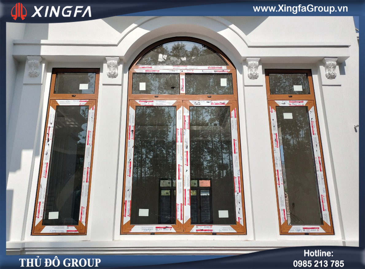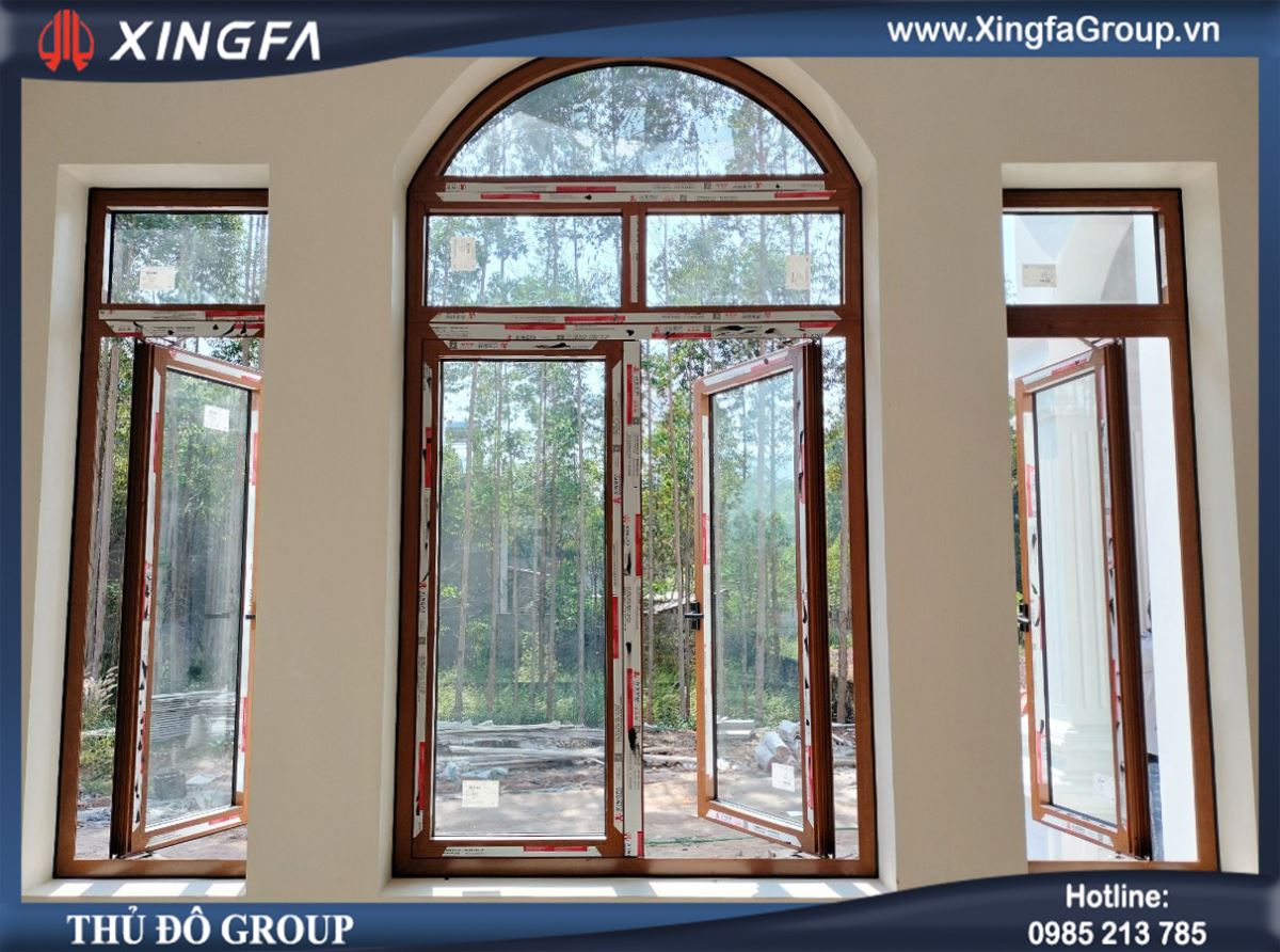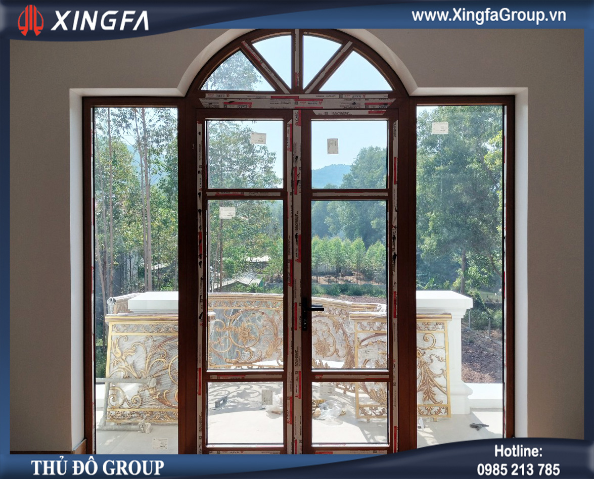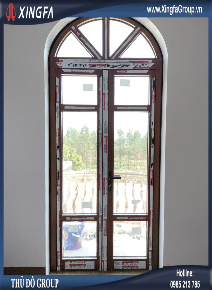 Hình ảnh cửa đi mở quay 2 cánh nhôm Xingfa có mái vòm bên trên