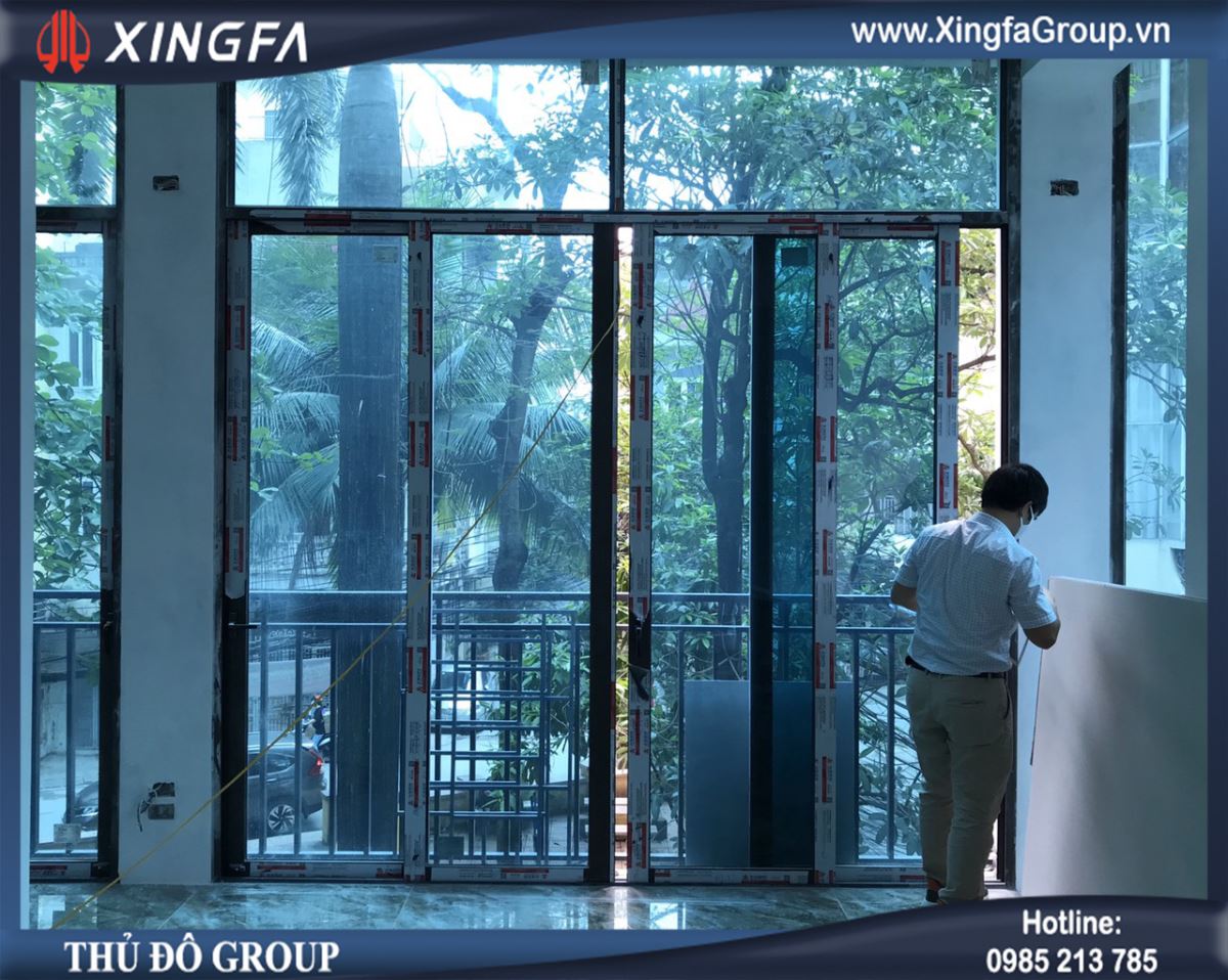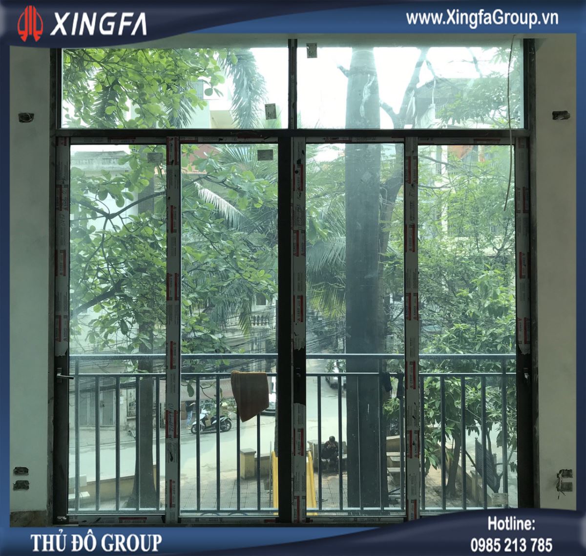 Cửa đi mở trượt nhôm Xingfa 2 cánh và 4 cánh tại đây được lắp đặt ở vị trí ban công. Đây là mẫu cửa có đặc điểm nhỏ gọn, cánh cửa chạy trên ray trượt ngang nên tốn ít diện tích, cho phép lắp đặt kích thước cửa lớn. Ngoài ra Thủ Đô Group còn sử dụng phần vách kính cố định để cách điệu cũng như làm tăng thêm diện tích lấy sáng cho toàn bộ khung cửa. Thiết kế cửa nhôm Xingfa kèm vách kính cố định này cũng rất phổ biến và được nhiều khách hàng ưa chuộng.