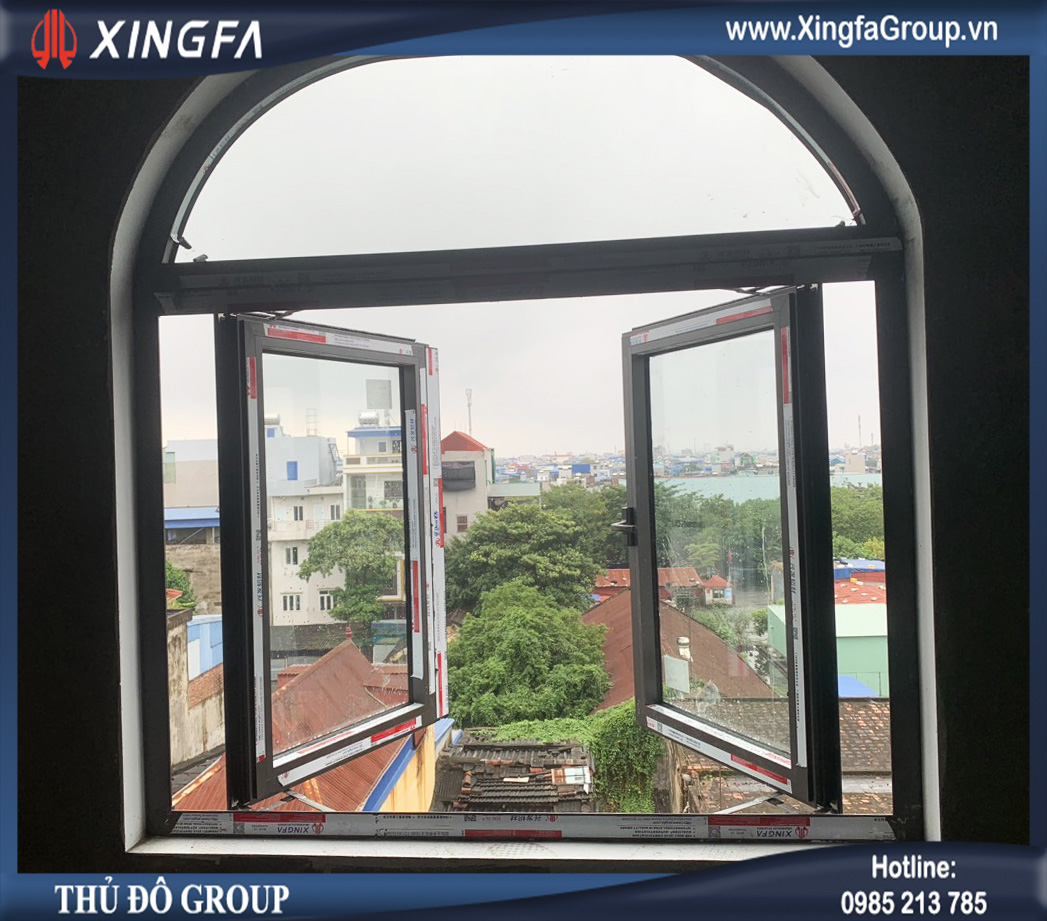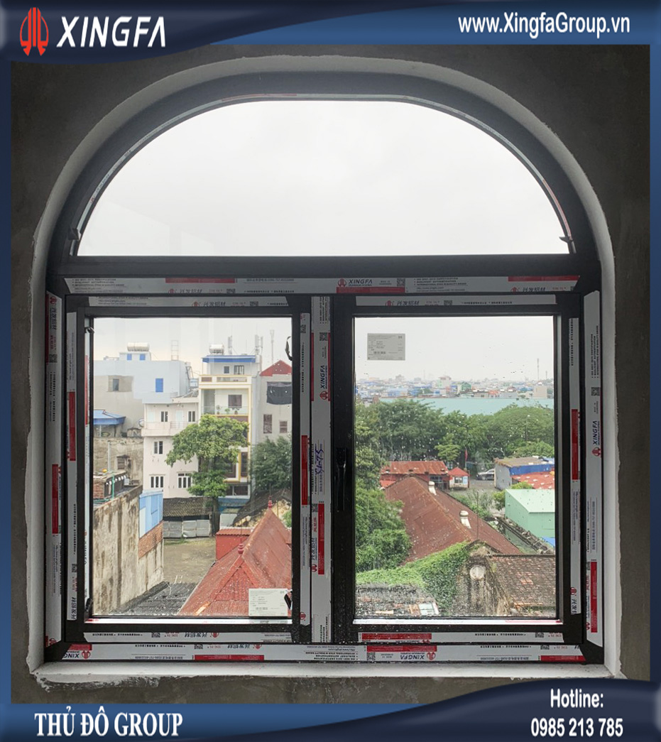 Hình ảnh cửa sổ mở quay 2 cánh nhôm Xingfa có vách kính uốn vòm