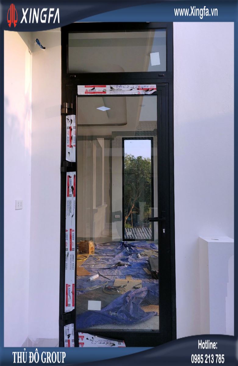 Hình ảnh một bộ cửa đi mở quay 1 cánh nhôm Xingfa tem đỏ
