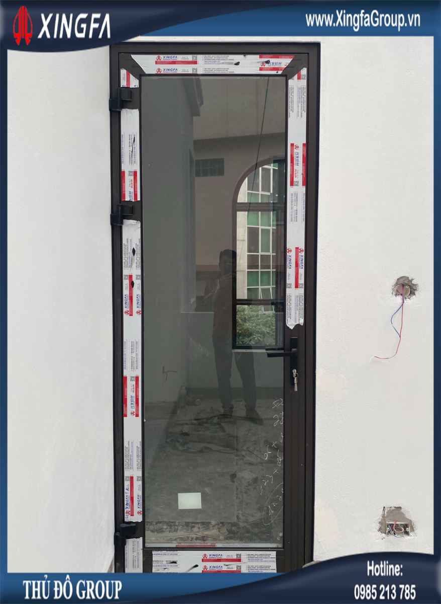 Hình ảnh thực tế cửa đi mở quay 1 cánh nhôm Xingfa nhập khẩu tem đỏ