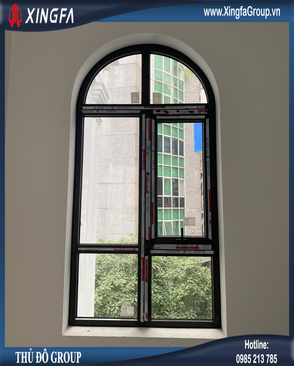 Hình ảnh cửa sổ mở hất 1 cánh kết hợp vách cố định uốn vòm nhôm Xingfa