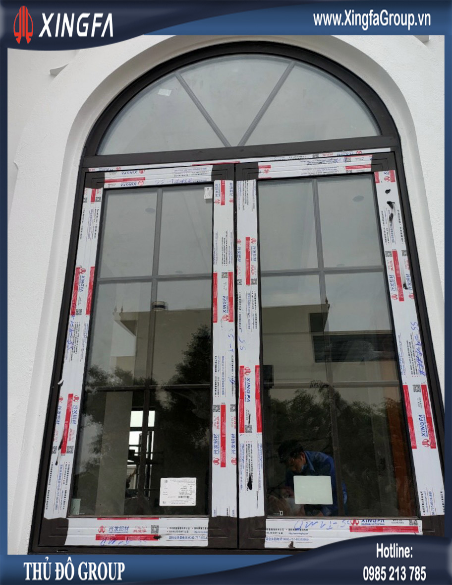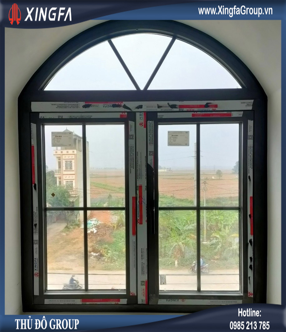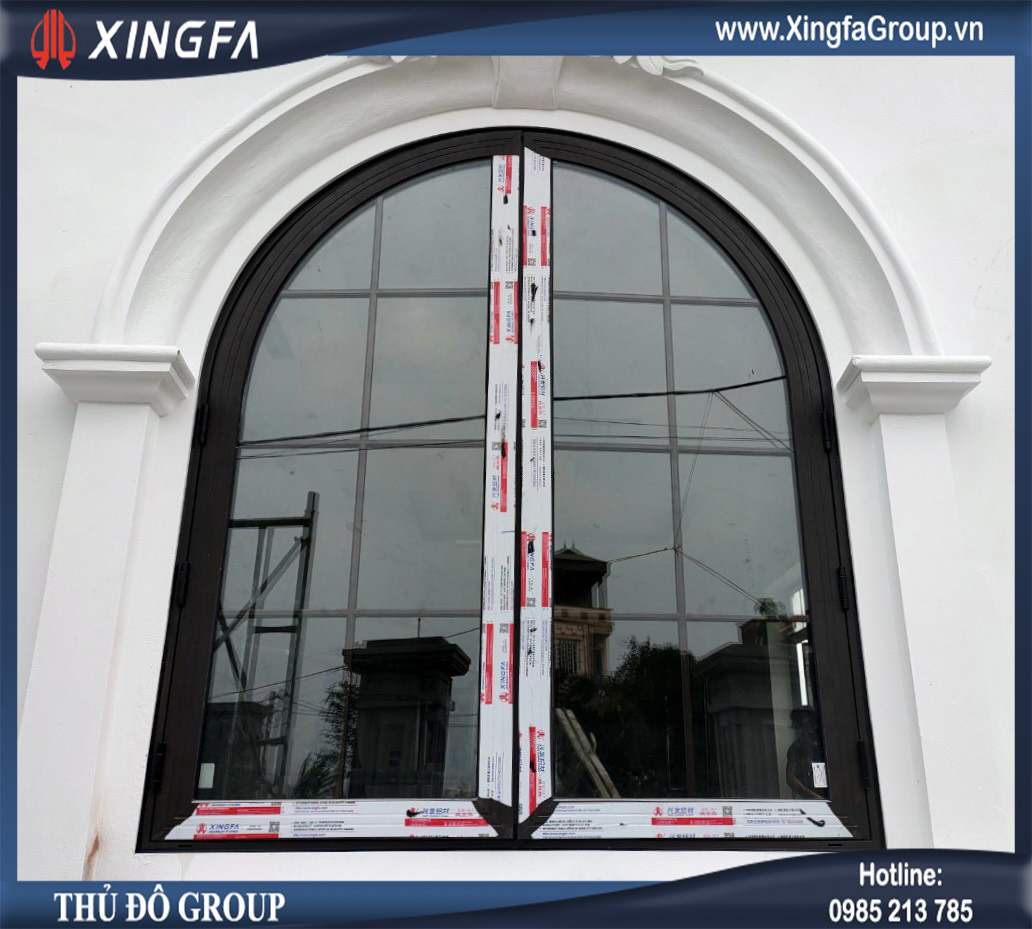 Hình ảnh cửa sổ mở quay 2 cánh nhôm Xingfa có vách kính mái vòm