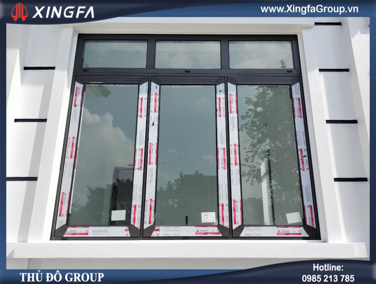 Hình ảnh cửa sổ mở quay 2 cánh nhôm Xingfa có vách cố định bên trên