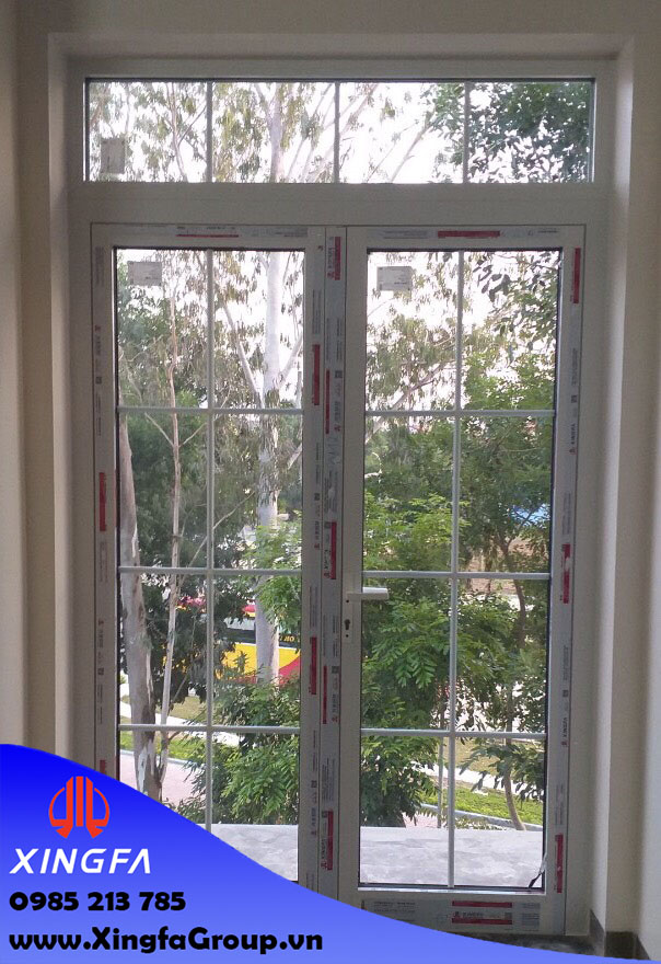 Ở mỗi mặt tiền, bên cạnh một bộ cửa sổ mở quay sẽ là hai cửa đi mở quay 2 cánh ở hai bên, tạo nên sự đối xứng. Cửa đi mở quay 2 cánh nhôm Xingfa cũng có thiết kế giống như cửa sổ mở quay với nhôm Xingfa hệ 55 mầu trắng, kính hộp 2 lớp và nan trang trí mầu trắng. Điều này mang lại sự đồng bộ tuyệt đối khi nhìn từ bên ngoài vào, kết hợp cùng mầu sơn của công trình, vừa đẹp vừa sang trọng. Ở một số vị trí khác ra hẹp hơn thì được sử dụng cửa nhôm Xingfa mở quay 1 cánh.