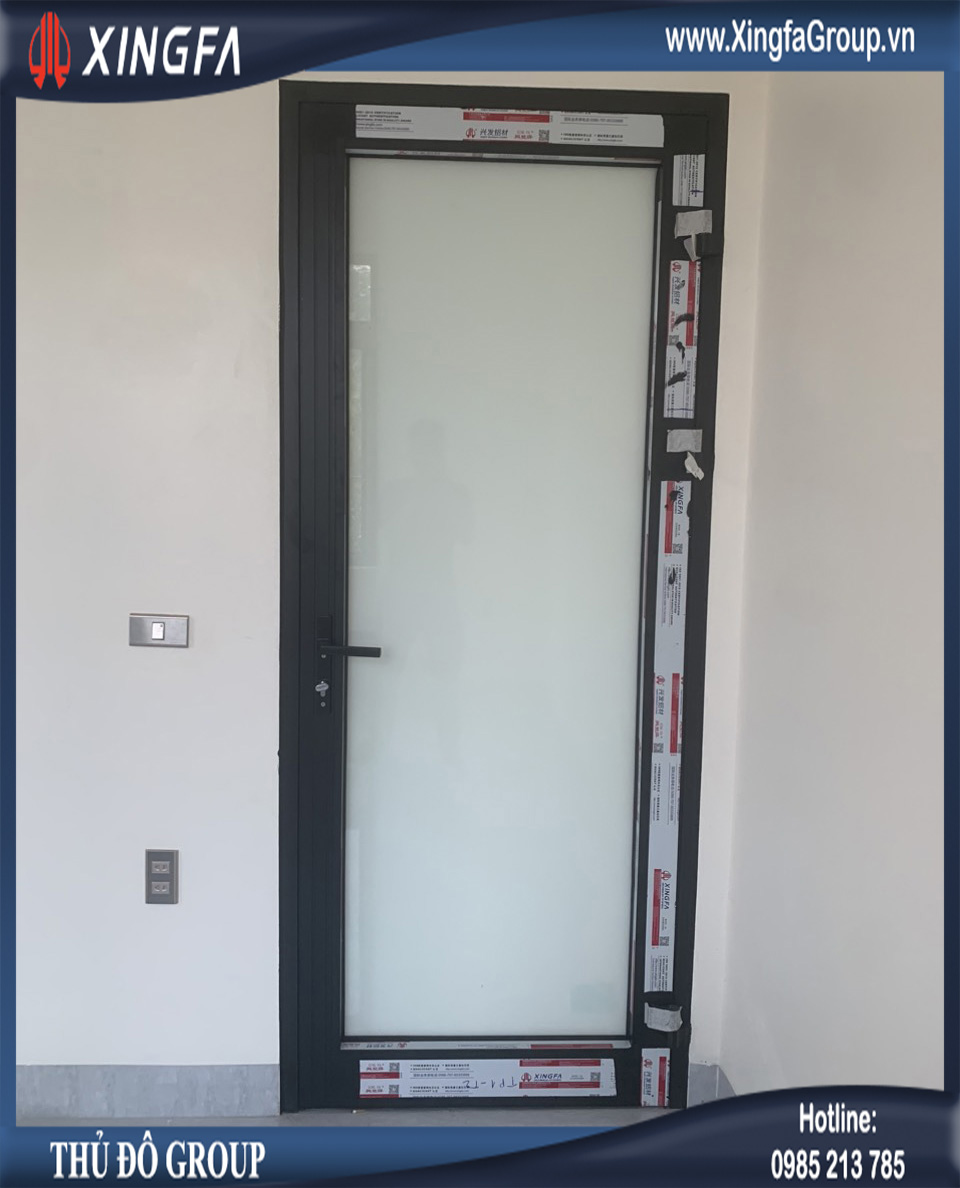 Hình ảnh cửa đi mở quay 1 cánh nhôm Xingfa đi kèm với kính trắng sữa