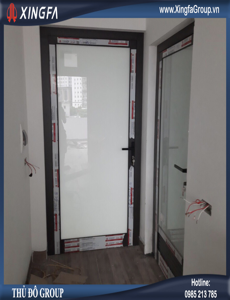 Hình ảnh cửa nhà vệ sinh mở quay nhôm Xingfa có kính trắng sữa