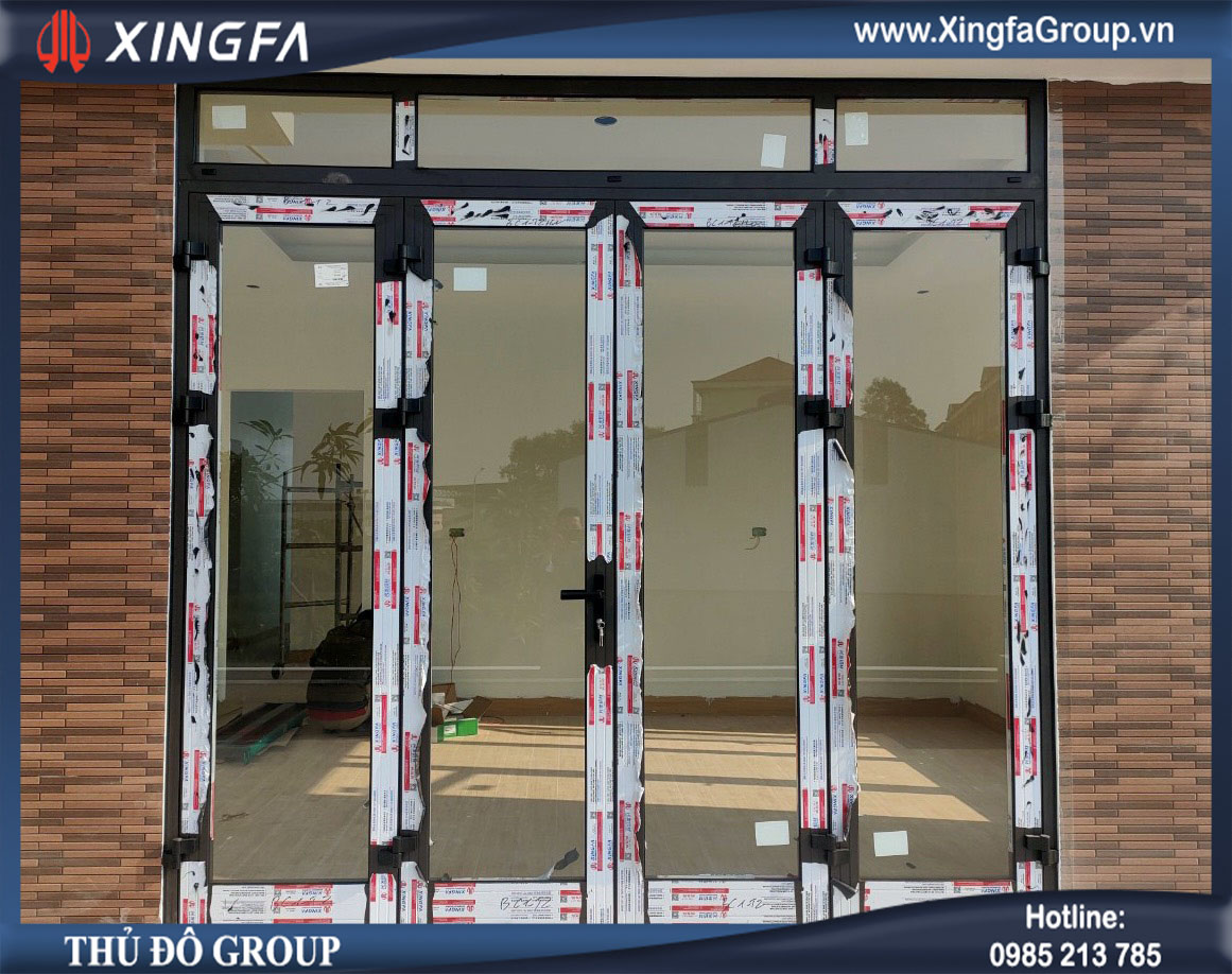 Tại công trình này có hai mẫu cửa đi là cửa mở quay nhôm Xingfa mầu nâu mẫu có 3 cánh và 4 cánh. Đối với cửa đi mở quay thì các thanh nhôm Xingfa là nhôm hệ 55 và độ dầy 2.0mm. Cửa nhôm Xingfa Thủ Đô Group được sản xuất với công nghệ ép góc dao 3 lưỡi đảm bảo các góc cửa vuông vắn, kín khít, mang lại độ bền và vững chắc cho tấm cửa. Cửa nhôm Xingfa có công năng mạnh mẽ, cách âm cách nhiệt và chịu nước, bền bỉ dưới thời tiết khắc nghiệt và tuổi thọ lâu năm. Cùng với đó, thanh nhôm được nhập khẩu chính hãng 100% đảm bảo chất lượng tiêu chuẩn quốc tế.