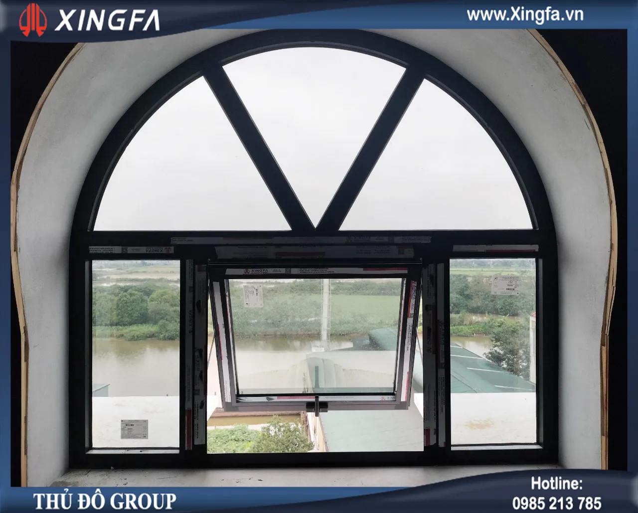 Hình ảnh cửa sổ mở hất 1 cánh kết hợp vách kính uốn vòm nhôm Xingfa nhập khẩu chính hãng