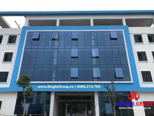 + Hệ thống mặt dựng sử dụng thanh nhôm Xingfa hệ 65 và kính an toàn Hải Long màu xanh dương
