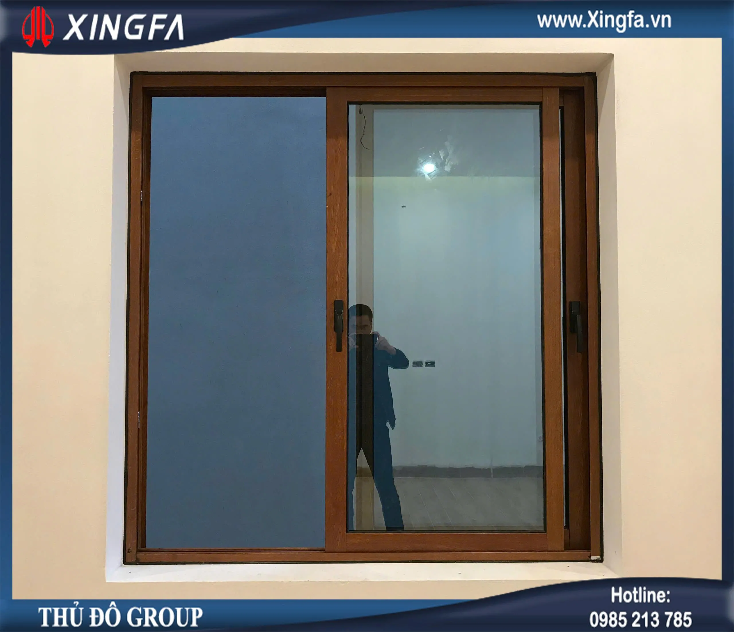 Mẫu cửa sổ mở trượt 2 cánh nhôm Xingfa mầu vân gỗ (mầu giả gỗ tự nhiên)