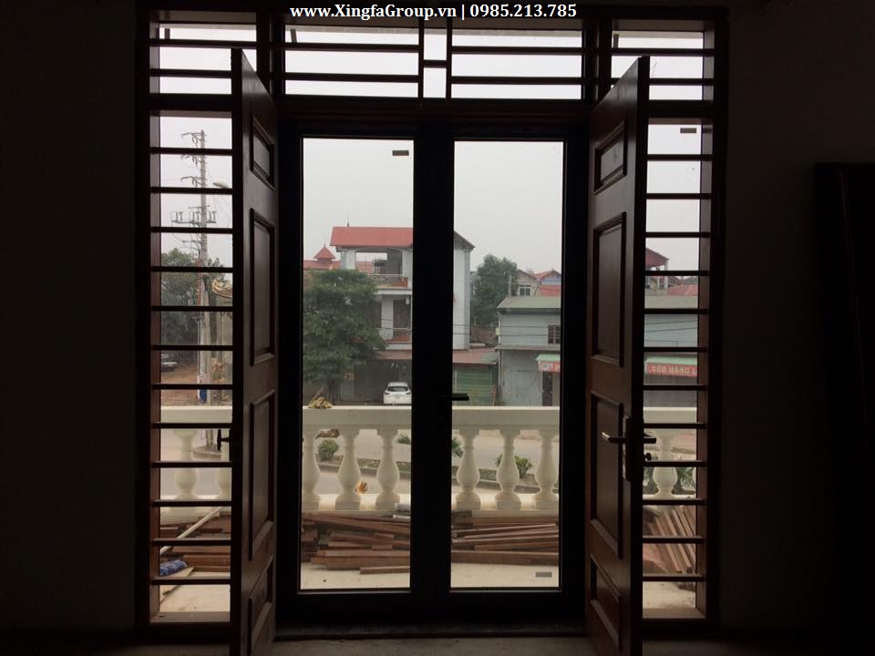 Mẫu cửa nhôm Xingfa nhập khẩu mầu Vân gỗ (mầu giả gỗ tự nhiên) sử dụng kính hộp 2 lớp an toàn cách âm cách nhiệt 6,38.9.6,38mm có na trang trí bên trong mầu vân gỗ